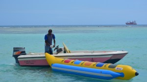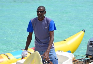 Tiene 52 años, pero parece de menos. Puertoplatense. Llego a Boca Chica muy pequeñito (3) y no ha vuelto a salir de allá. 30 años trabajando en la playa. Esta en excelente forma porque todos los días se levanta a nadar. Le va regular en este negocio…. ”Consigo para comer” … El bote es alquilado y por cada vuelta, se gana unos RD$200. Tiene 5 hijos de dos matrimonios diferentes, pero todos viven con él y su segunda esposa. “Mi esposa me ayuda, es profesora y ahora va a trabajar dos turnos”. (Foto: RossQ)